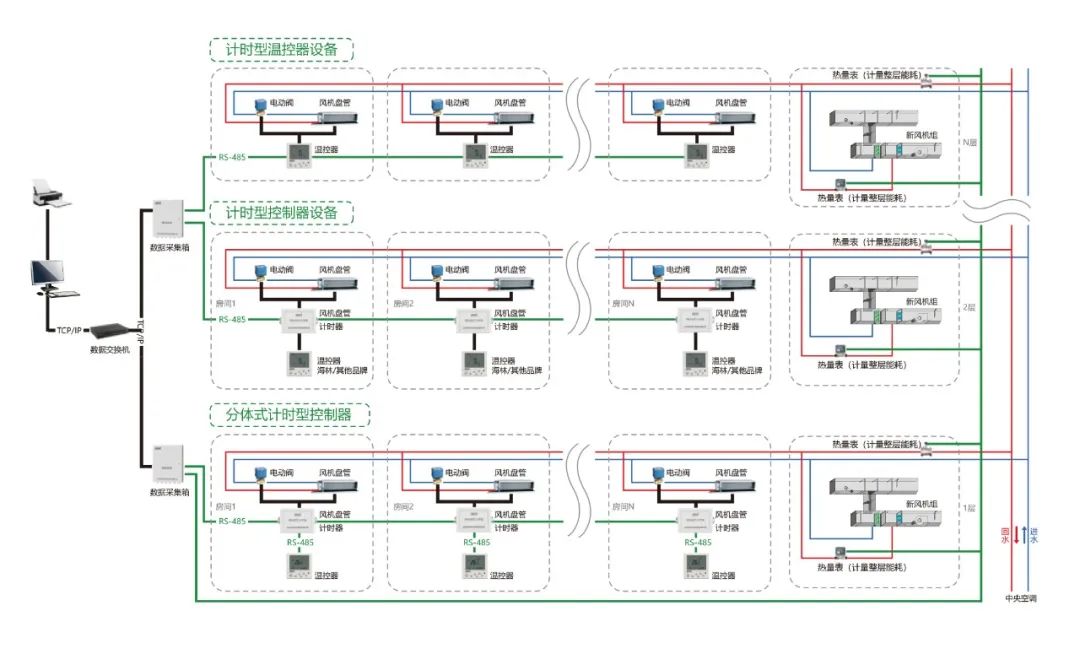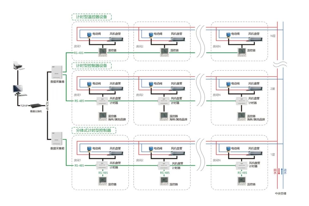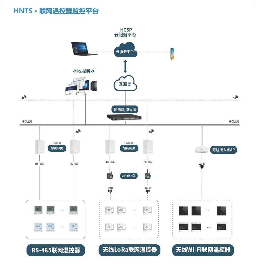 海林HNTS末端溫控器集控系統(tǒng)集自動化控制技術(shù)、計算機網(wǎng)絡(luò)技術(shù)于一體,可同時集中或獨立對多臺末端設(shè)備的啟停、水閥的開閉及溫度設(shè)置進行控制。有三種聯(lián)網(wǎng)集控方式:RS-485 有線方式、 LoRa 無線方式和 Wi-Fi 無線方式。