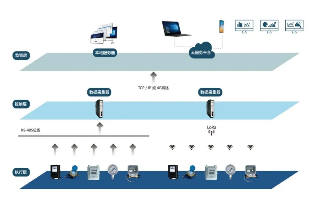 通過(guò) RS-485 總線或 LoRa 通訊模塊,將計(jì)量表具的數(shù)據(jù)收集到智能網(wǎng)關(guān),在施工布線困難的情況下,采用 LoRa 無(wú)線通訊模塊,免去復(fù)雜的施工布線,將計(jì)量表具的數(shù)據(jù)簡(jiǎn)單有效地傳輸?shù)街悄芫W(wǎng)關(guān)。