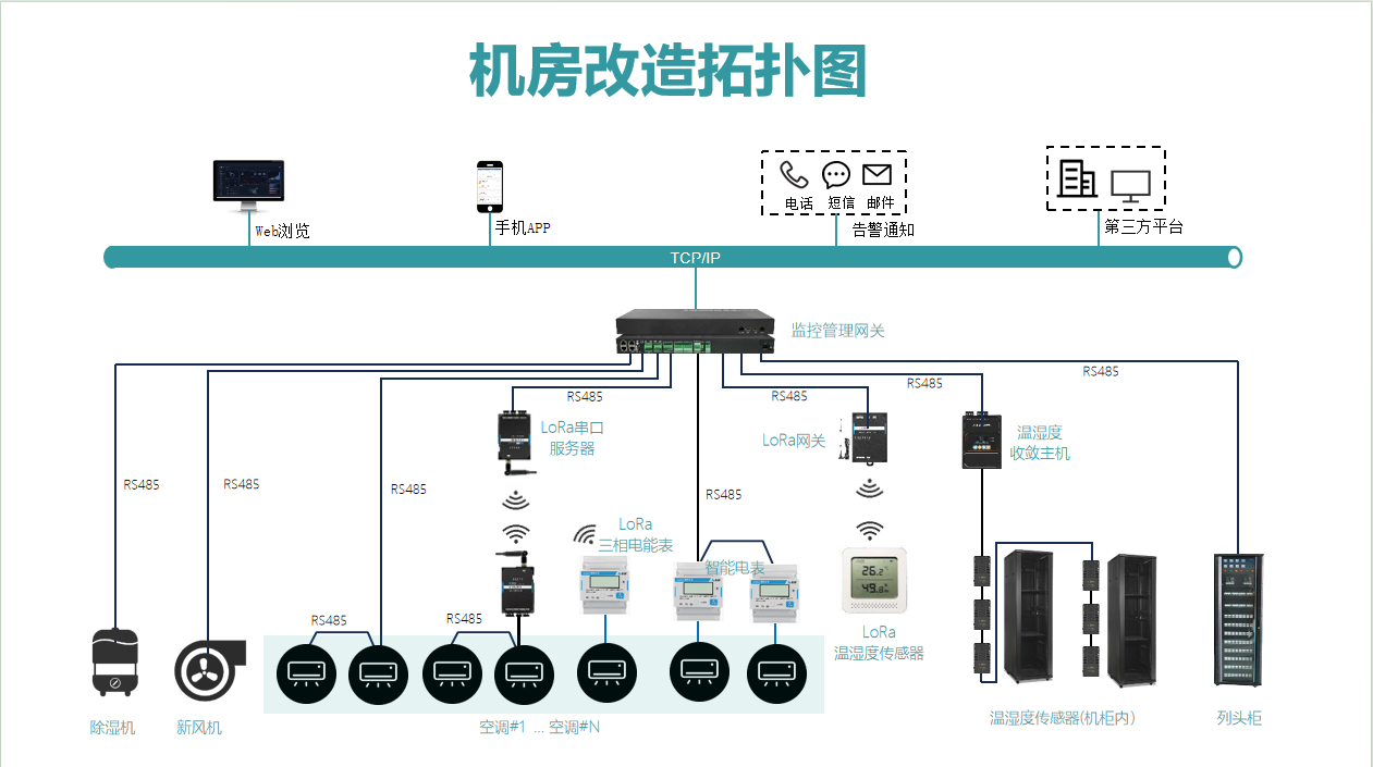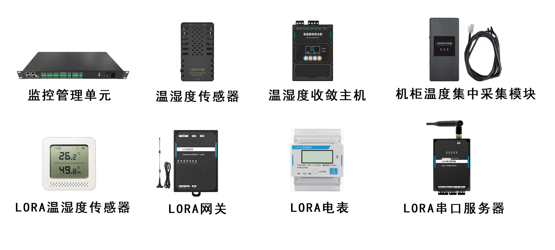 該系統(tǒng)設備由:監(jiān)控管理單元、溫濕度傳感器/收斂主機、機柜溫度集中采集模塊、LORA傳感器/網(wǎng)關/電表/串口服務器組成