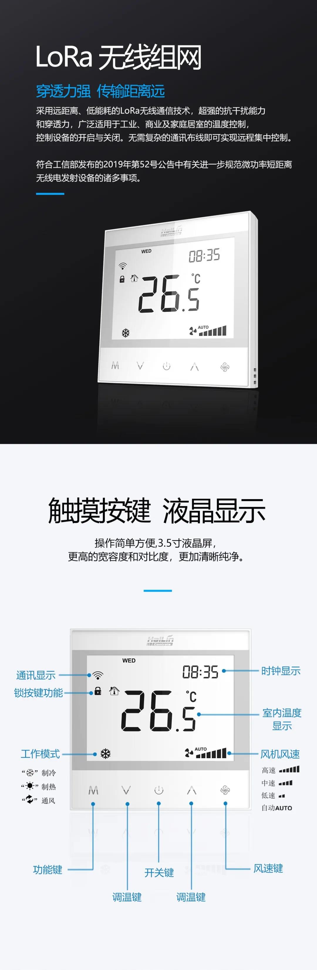 海林最新推出的HL7031無線LoRa溫控器,是溫控器與LoRa無線模塊的結(jié)合,適用于工業(yè)、商業(yè)及家庭居室的溫度控制,同時(shí)應(yīng)用在樓宇集中控制系統(tǒng)中。