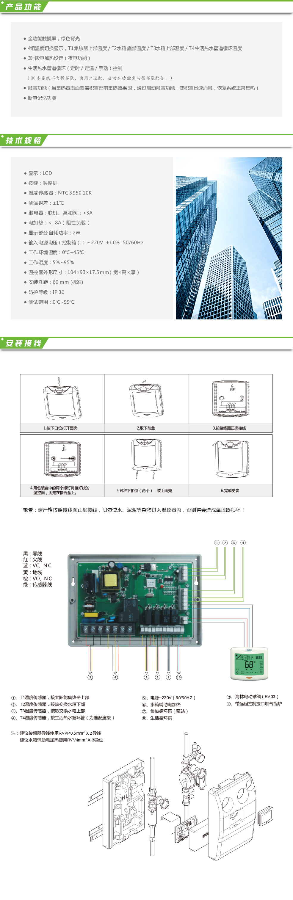 HS2018分體式太陽(yáng)能熱水器控制器應(yīng)用于太陽(yáng)能熱水系統(tǒng)的智能化監(jiān)控與管理。采用綠色背光,液晶觸摸屏,控制主板與控制面板分離式設(shè)計(jì),并通過(guò)溫差和實(shí)時(shí)通訊,來(lái)控制太陽(yáng)能集熱器端與水箱端熱交換循環(huán)泵、用戶(hù)端生活熱水循環(huán)泵和定時(shí)啟動(dòng)輔助電加熱等設(shè)備,以實(shí)現(xiàn)系統(tǒng)自動(dòng)運(yùn)行,方便用戶(hù)使用的目的。