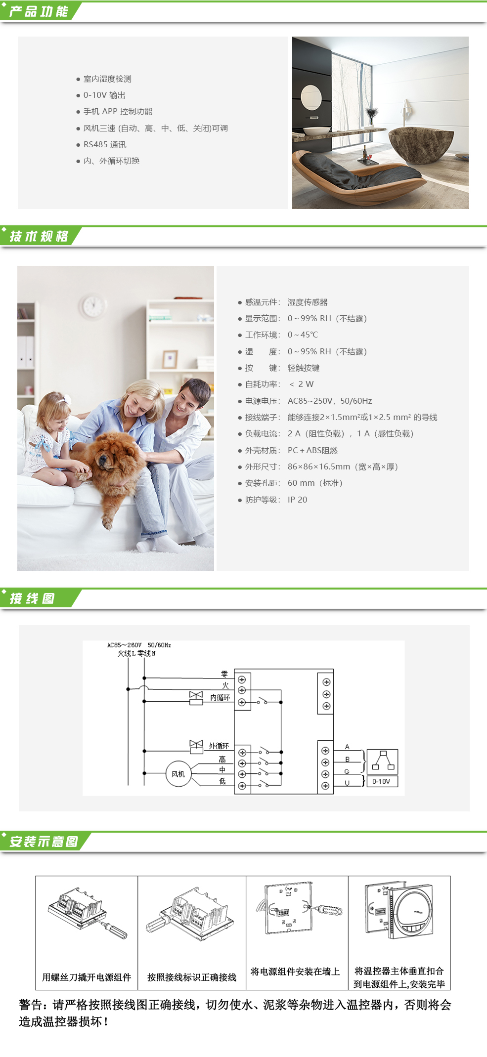 豪華型大液晶顯示新風(fēng)控制器,可通過(guò)無(wú)線 APP 遠(yuǎn)程操控,適用于工業(yè)、商業(yè)及 家庭居室的新風(fēng)控制,可選擇風(fēng)機(jī)為室內(nèi)、室外循環(huán)模式,風(fēng)機(jī)三速(自動(dòng)、高、中、 低、關(guān)閉)可調(diào),帶 RS485 通訊轉(zhuǎn)換控制。 新風(fēng)控制器采用微電腦控制技術(shù),大屏幕液晶顯示,可從云端獲取室內(nèi)環(huán)境信息 并可通過(guò)液晶顯示:PM2.5 濃度顯示(ug/m3)、濕度顯示(%RH)、CO2濃度顯示(PPM)、 時(shí)鐘顯示 ...