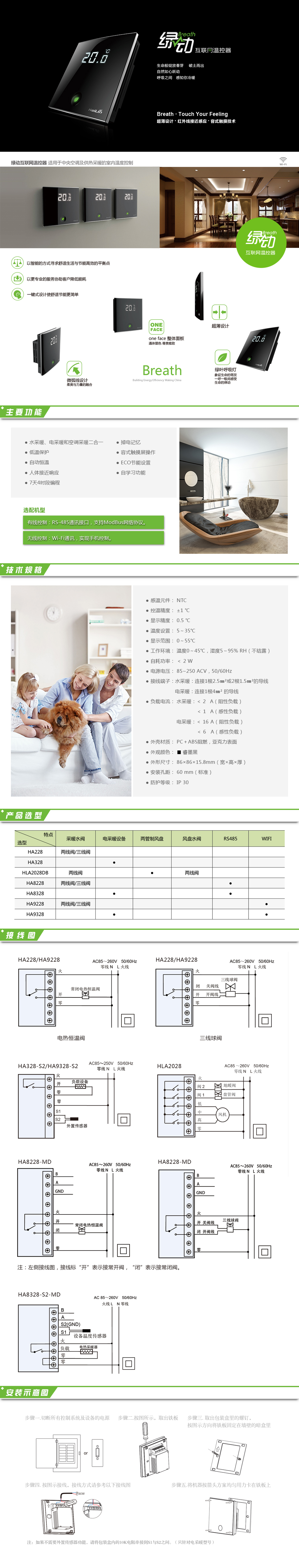 綠動采暖溫控器包括“本地控制、有線控制、無線控制”三種類型,適用于家庭地板采暖系統(tǒng)或散熱器采暖系統(tǒng)的室內(nèi)溫度控制。微弧線曲面設(shè)計彰顯柔美與力量融合。面板整體睿墨含蓄尊貴雅致。綠葉呼吸燈時尚點綴,如呼吸間感受生命律動象征生命萌發(fā)。
