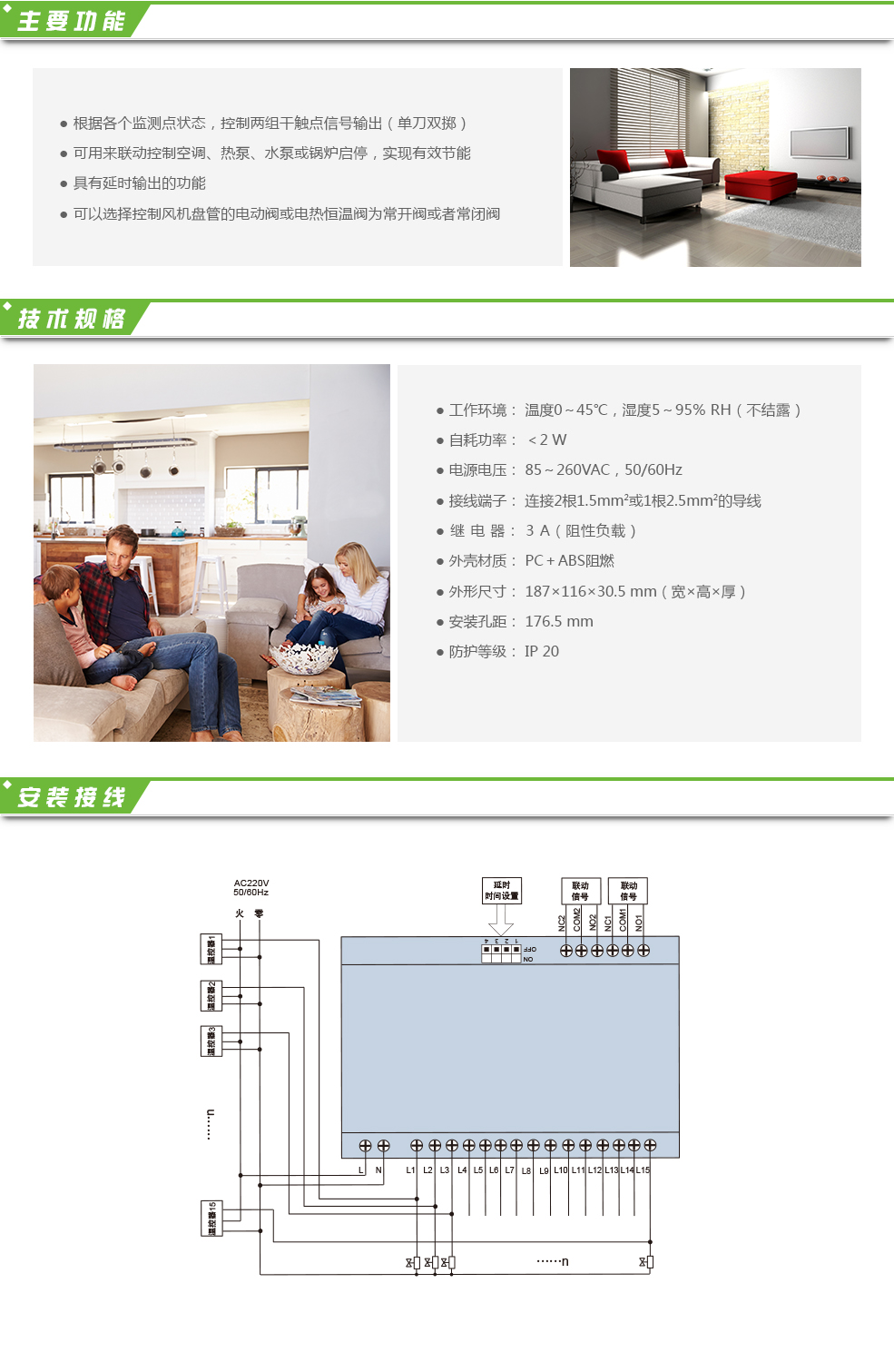聯(lián)機(jī)控制器HL309-15,可自動(dòng)檢測(cè)各個(gè)風(fēng)機(jī)盤(pán)管或電熱恒溫閥的工作狀態(tài),根據(jù)風(fēng)機(jī)盤(pán)管或電熱恒溫閥的開(kāi)關(guān),輸出干觸點(diǎn)的聯(lián)機(jī)控制信號(hào)。當(dāng)所有風(fēng)機(jī)盤(pán)管或電熱恒溫閥關(guān)閉后,輸出的干觸點(diǎn)斷開(kāi);而當(dāng)有一個(gè)或多個(gè)風(fēng)機(jī)盤(pán)管或電熱恒溫閥啟動(dòng)后,輸出的干觸點(diǎn)閉合。合理分配能源,減少能源浪費(fèi),能達(dá)到真正的“既舒適又節(jié)能”的目的。