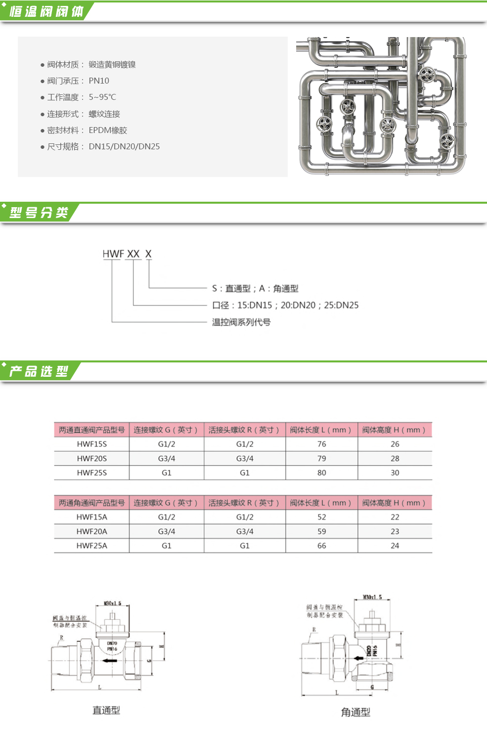 恒溫閥HWF是安裝在散熱器上的自動控制閥門。與控制器T36配套使用能夠自動感知環(huán)境溫度,并在不通過外力的情況下進(jìn)一步調(diào)節(jié)閥開度,控制水流的大小,進(jìn)而維持房間溫度在設(shè)定溫度。海林溫控閥嚴(yán)格按照歐盟標(biāo)準(zhǔn)EN215進(jìn)行生產(chǎn),設(shè)計精巧,控溫精確,可滿足各種管網(wǎng)結(jié)構(gòu)的應(yīng)用。