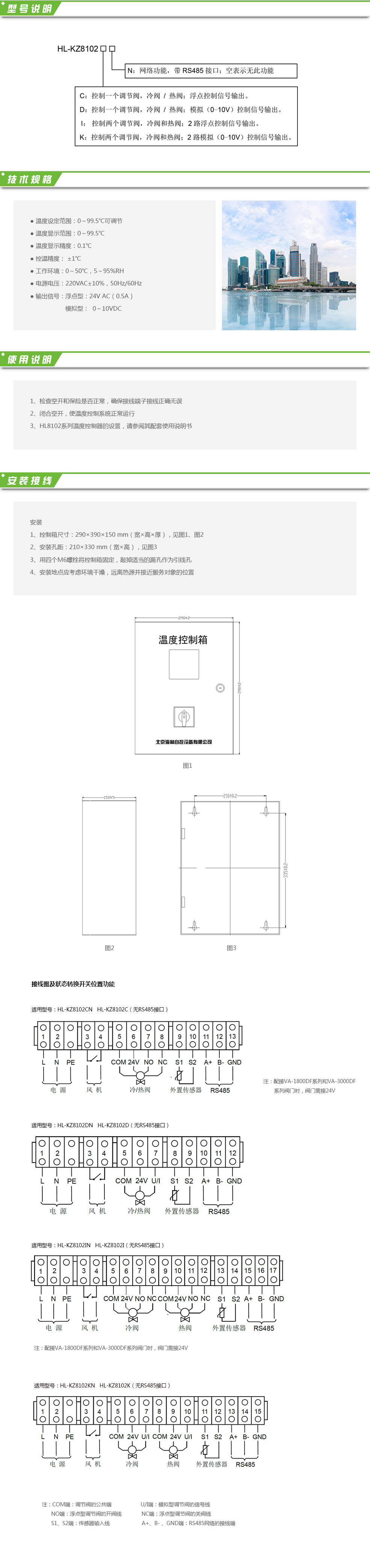 HL-KZ8102系列溫度控制箱配裝HL8102系列溫度控制器,主要應(yīng)用于水系統(tǒng)或風(fēng)系統(tǒng)的溫度控制。通過對(duì)檢測(cè)參數(shù)與溫度控制器上用戶設(shè)定的參數(shù)相比較、判斷,控制電動(dòng)調(diào)節(jié)閥的開度,根據(jù)溫差控制風(fēng)機(jī)的工作狀態(tài)(起動(dòng)與停止),從而達(dá)到恒定水溫或室溫的目的。